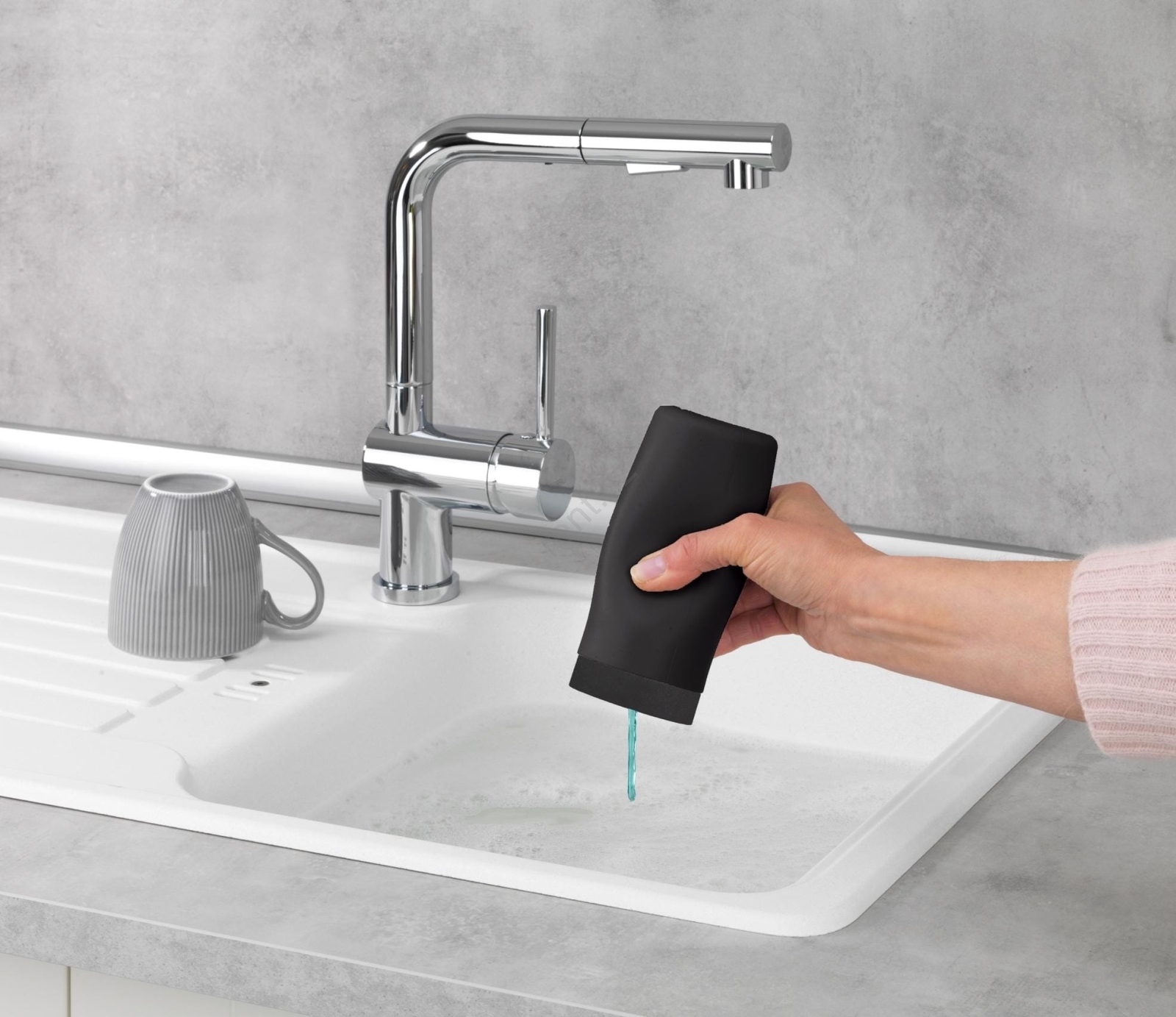 • Elegantní dávkovač na mycí prostředek v moderní černé barvě.