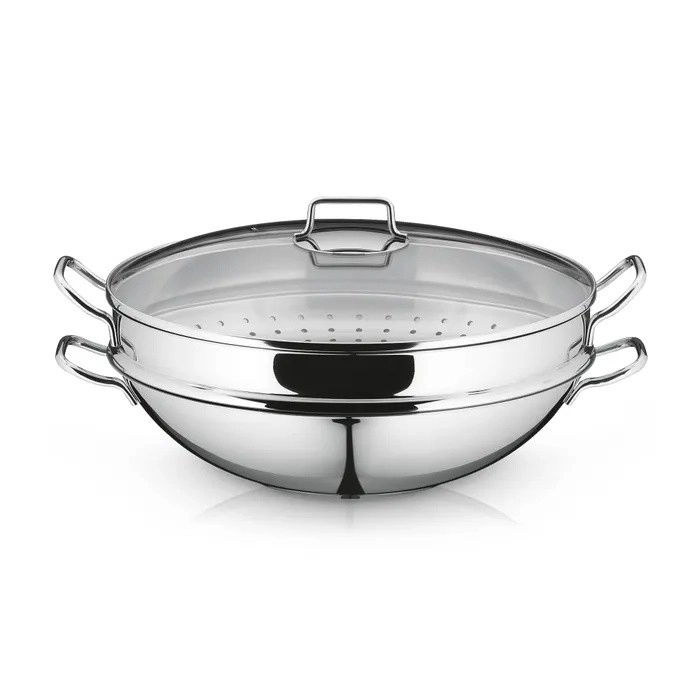 • Kompletní 4dílná sada: Balení obsahuje wok pánev o průměru 36 cm, skleněnou poklici, děrovanou parní vložku a nerezovou odkládací mřížku pro udržování teploty pokrmů.